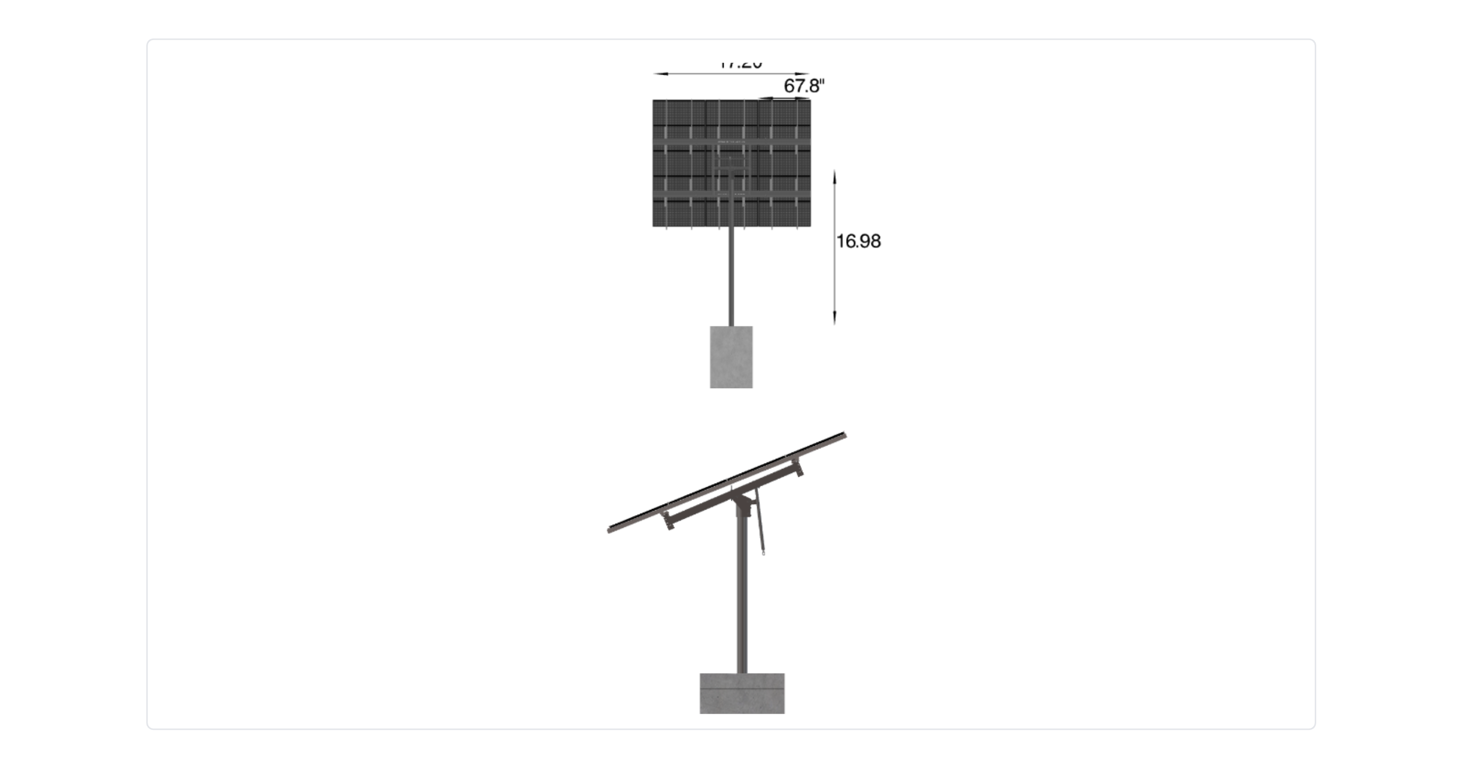 This Pole Mount is designed to meet your site-specific inputs which are modules with dimensions of 67.8 inches by 44.6 inches and an array layout of 3 wide by 5 high.