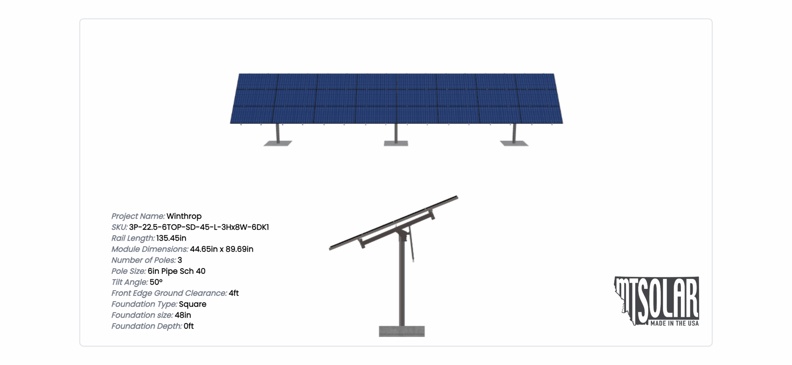 This Pole Mount is designed to meet your site-specific inputs which are modules with dimensions of 89.69 inches by 44.65 inches and an array layout of 8 wide by 3 high.