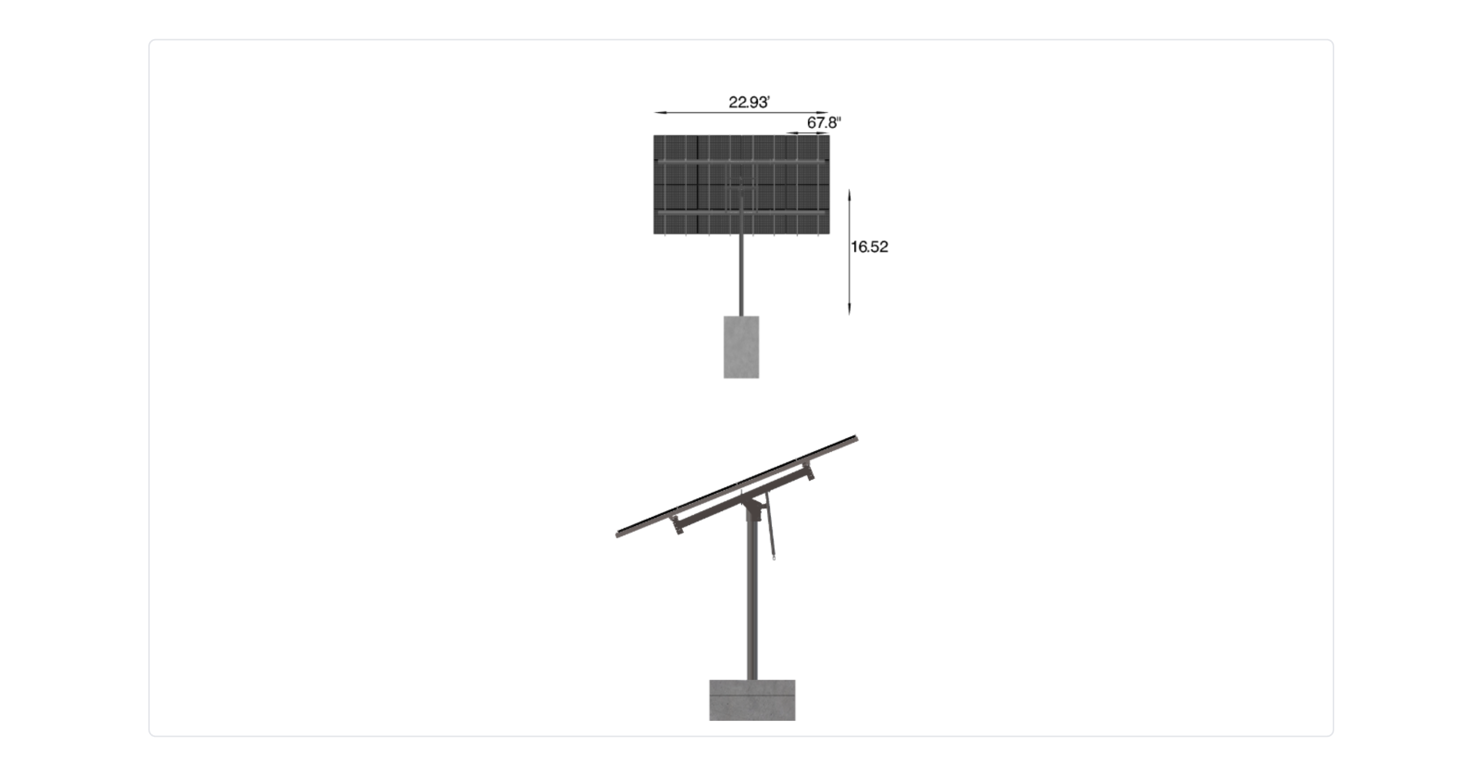 This Pole Mount is designed to meet your site-specific inputs which are modules with dimensions of 67.8 inches by 44.65 inches and an array layout of 4 wide by 4 high.